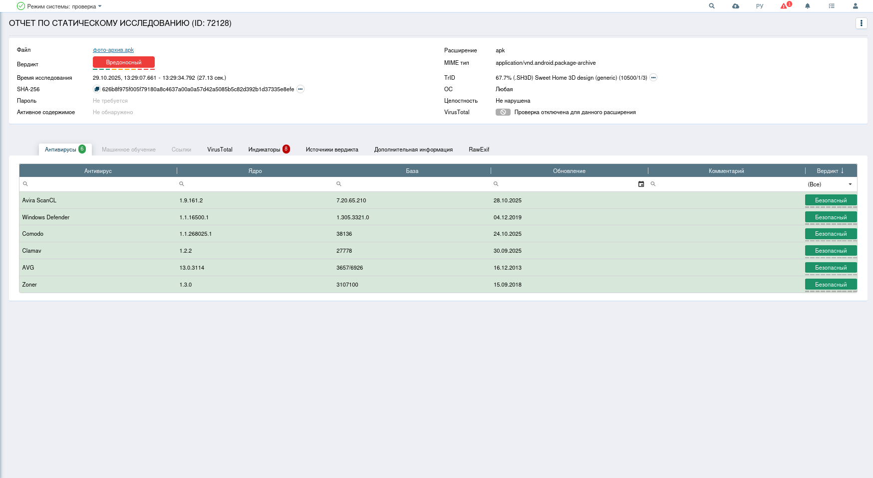 Во вкладке «Источники вердикта» строится графическая карта с источниками и их вердиктами, а также общим вердиктом по исследуемому файлу.