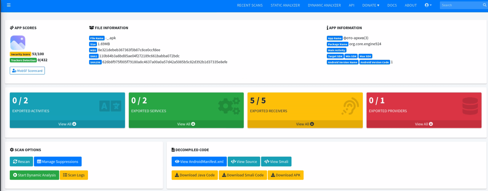 После предварительного анализа артефакт был загружен в Mobile Security Framework (MobSF) для статической декомпиляции и оценки структуры, API-вызовов и поведения. Несмотря на признаки упаковки, MobSF успешно реконструировал основной .dex и позволил провести детальный обзор активности приложения.