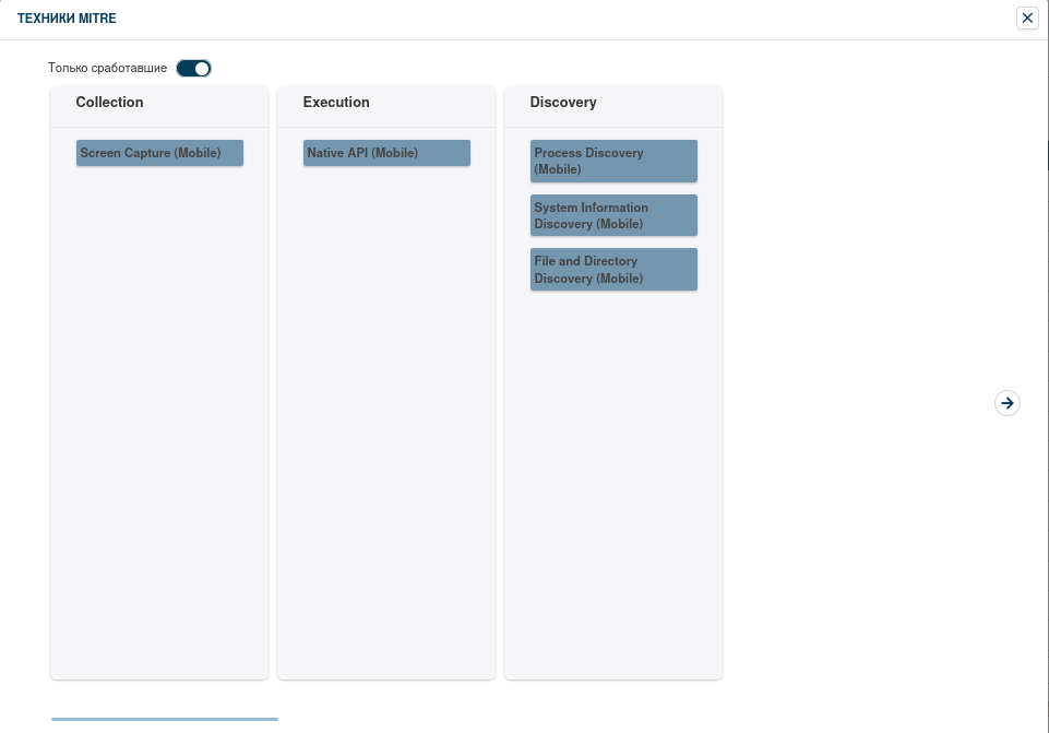 - PROCESS DISCOVERY (MOBILE) - Сработавшие индикаторы: Сканирование выполняющихся процессов. ПО осуществляет сбор списка и свойств выполняющихся процессов (через /proc, ps или API) для разведки окружения.