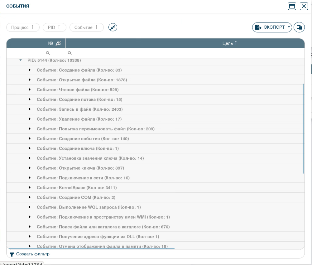 Во вкладке «События» отображаются конкретные процессы и события, которые происходят после запуска ВПО. На шифровальщик указывают следующие моменты: создание файла (83 шт.), открытие файла (1878 шт.), запись в файл (2043 шт.) и попытка переименовать файл (209 шт.).