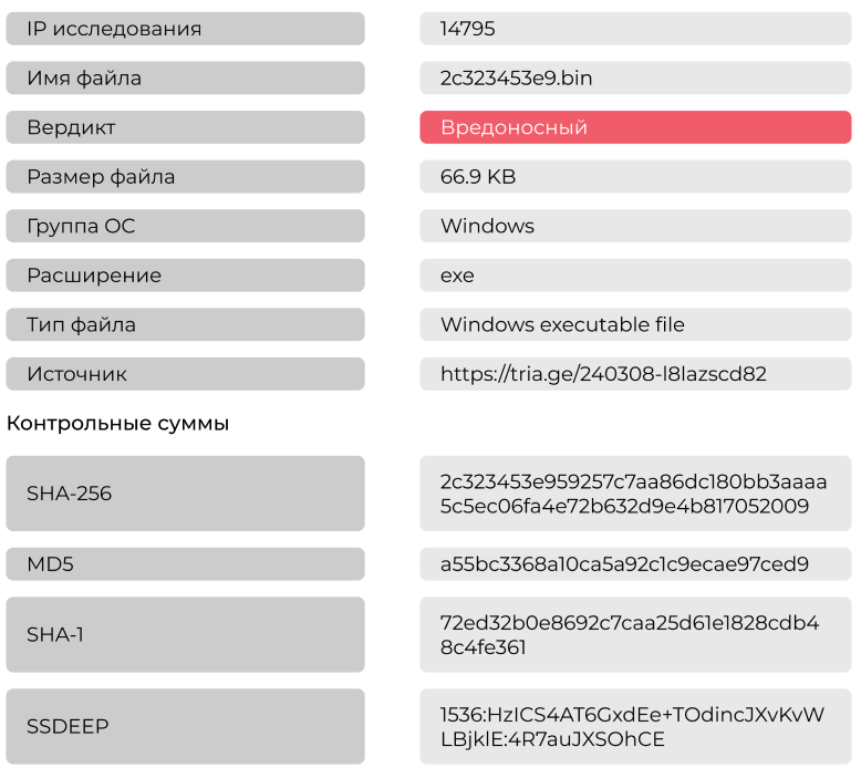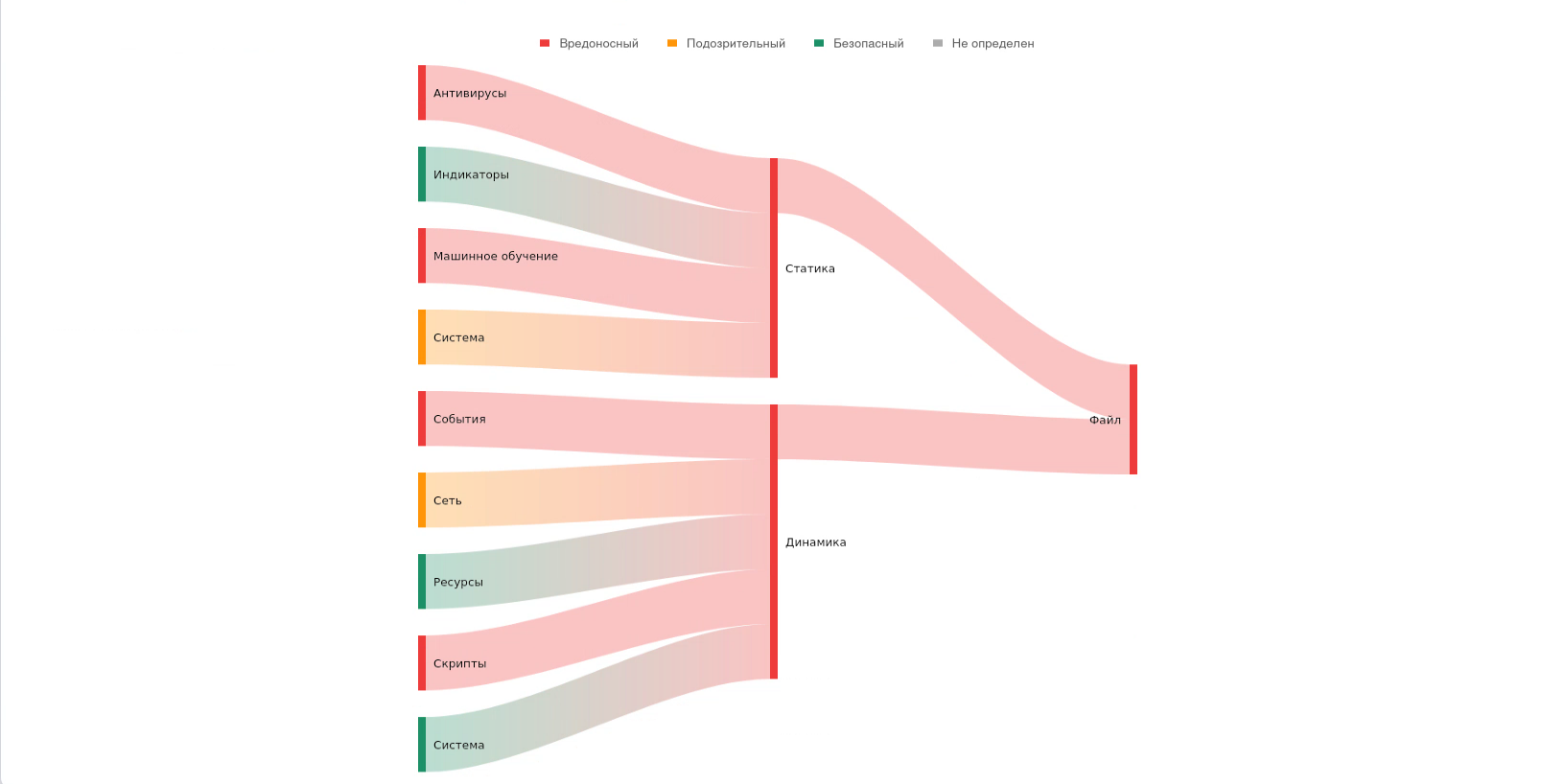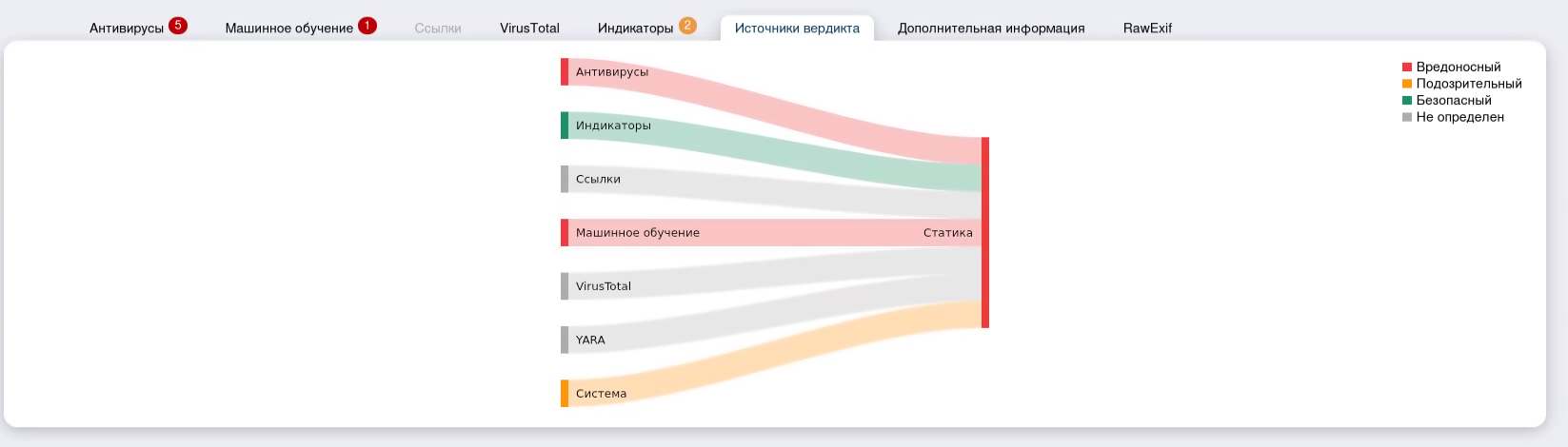 Во вкладке «Источники вердикта» строится графическая карта с источниками и их вердиктами, а также общим вердиктом по исследуемому файлу со стороны статического анализа.