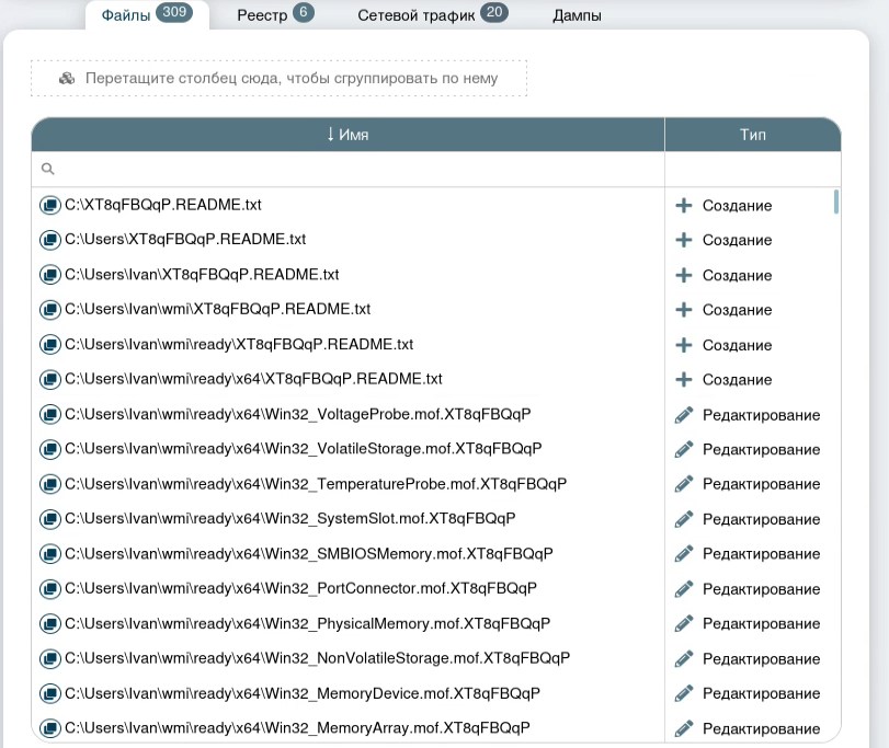Вкладка «Файлы» показывает созданные/редактированные шифровальщиком файлы.