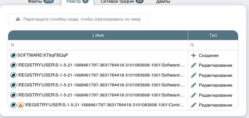 Вкладка «Реестр» показывает события в реестре операционной системы Windows.