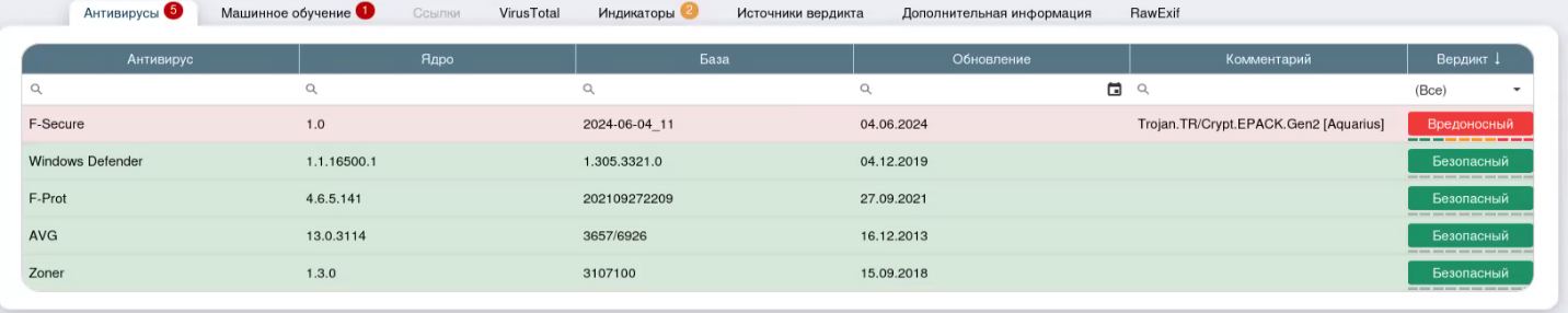 В ходе статического исследования файлу был присвоен вредоносный вердикт. Антивирус F-Secure определил наличие вируса «trojan» в файле.