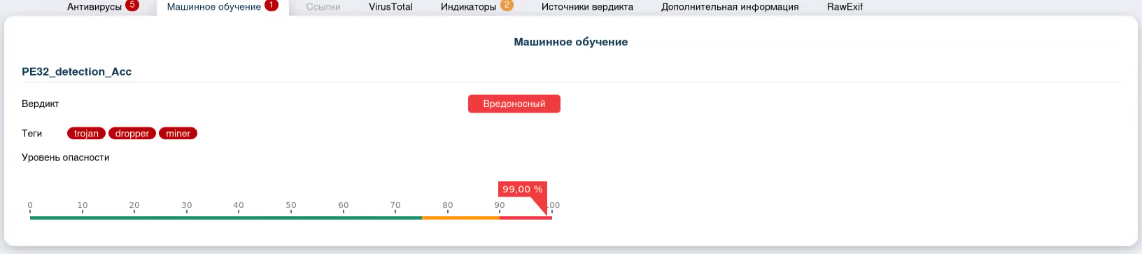 Модуль машинного обучения также выдал вредоносный вердикт, указав теги: trojan, dropper и miner.