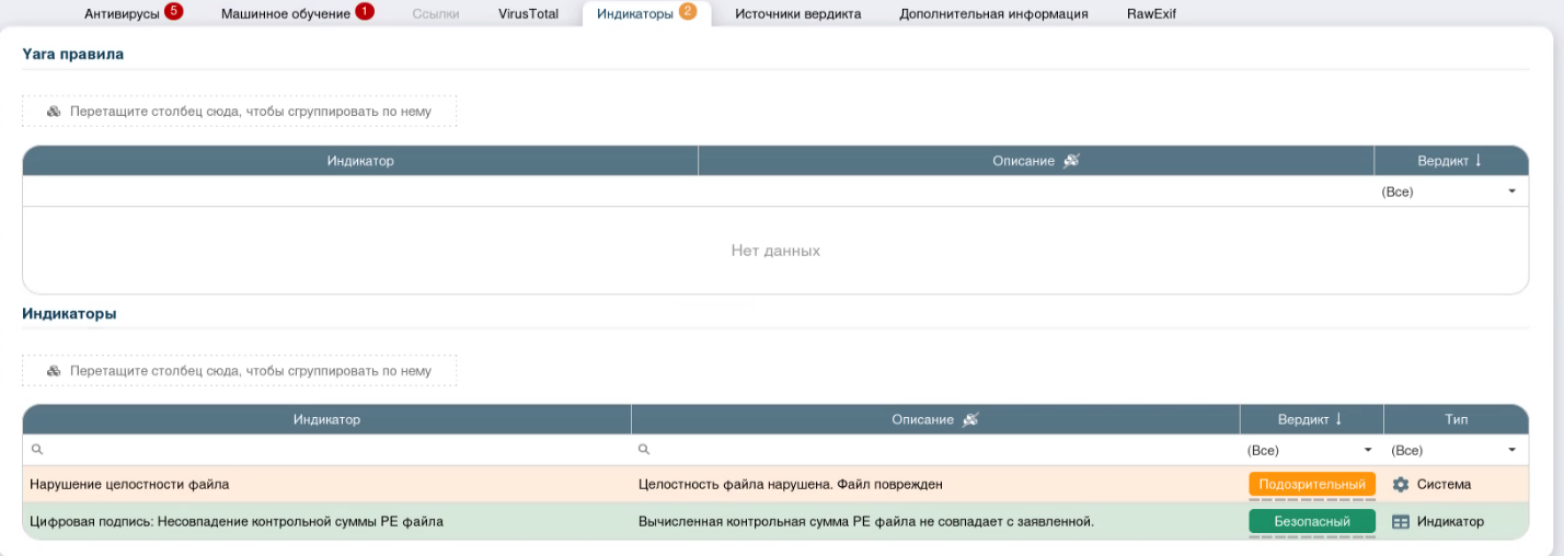 Во вкладке «Индикаторы» сработали информирующие индикаторы «Цифровая подпись: Несовпадение контрольной суммы PE файла» и «Нарушение целостности файла" .