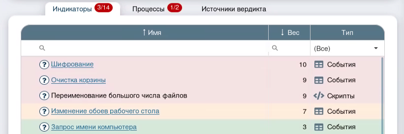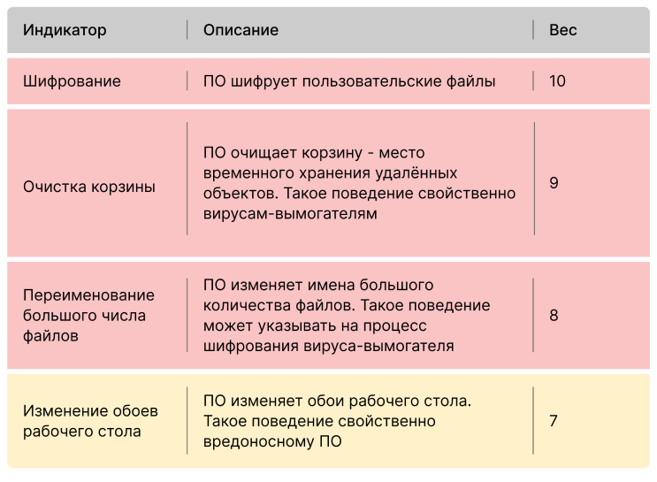 Ниже представлены вредоносные и подозрительные индикаторы динамического анализа с их описанием и весом в системе ATHENA