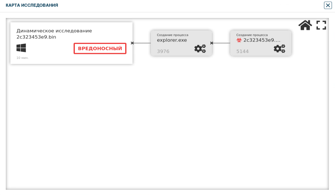На карте исследования можно увидеть, как проходят процессы после запуска вредоносного файла .