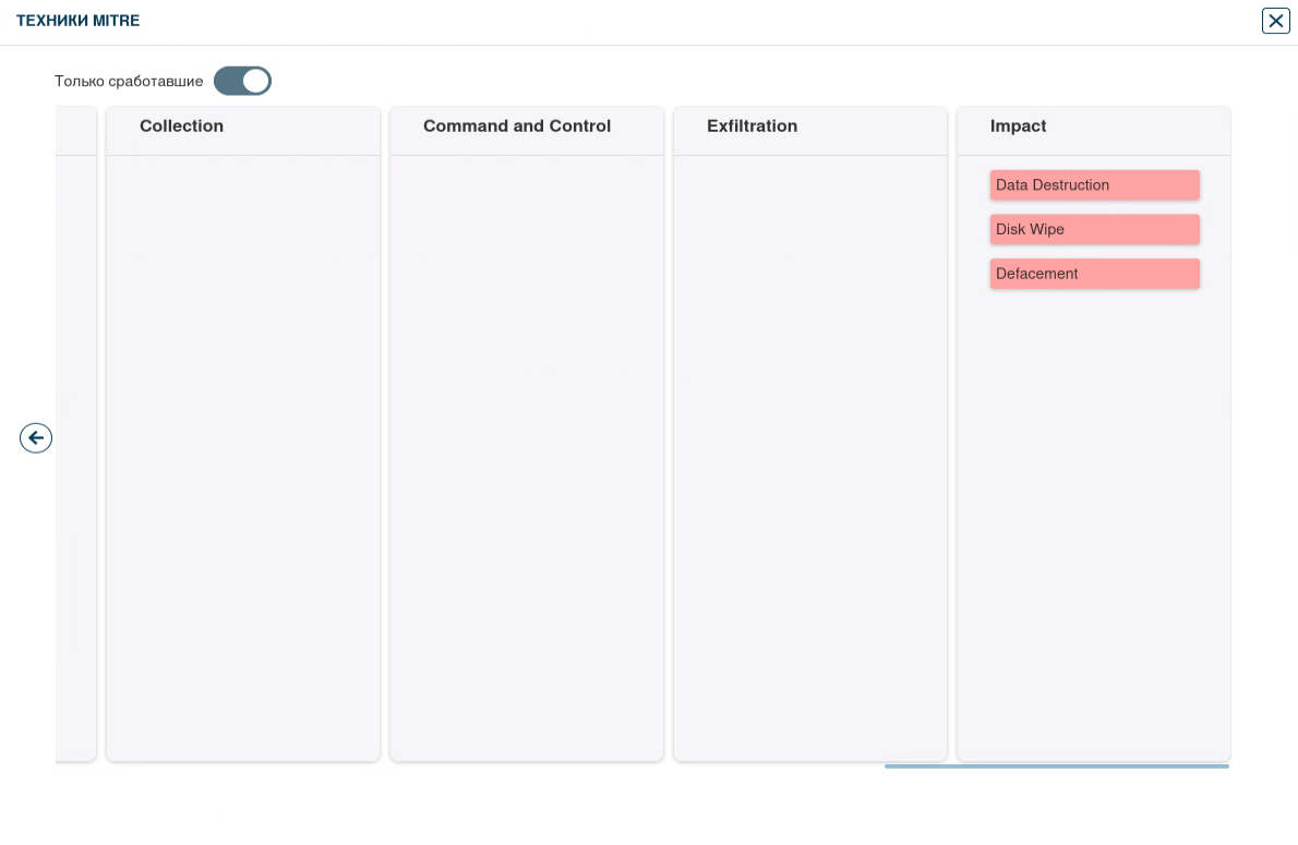- Data Destruction - злоумышленники уничтожают данные и файлы в системах или в сети, чтобы прервать доступность систем, служб и сетевых ресурсов. Злоумышленники могут перезаписать файлы и каталоги произвольно сгенерированными данными, чтобы сделать их безвозвратными. Вредоносное ПО, предназначенное для уничтожения данных, может иметь черве-подобные функции для распространения по сети с использованием дополнительных методов, таких как действительные учетные записи, сброс учетных данных ОС и проч.