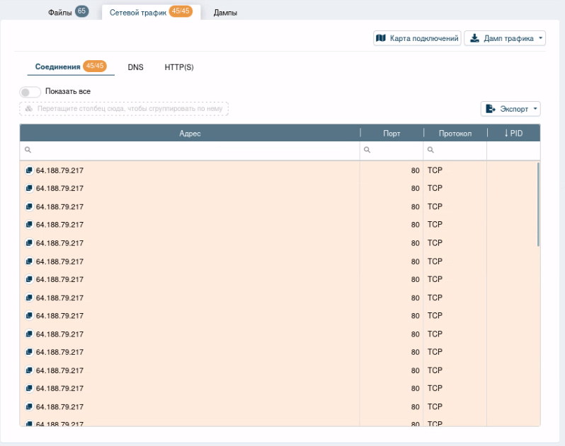 В разделе «Сетевой трафик» отображаются все подключения в интернет, зафиксированные во время динамического исследования файла. Если строки подсвечены оранжевым или красным, значит IP-адрес, к которому было подключение, с высокой вероятностью находится в блок-листе.