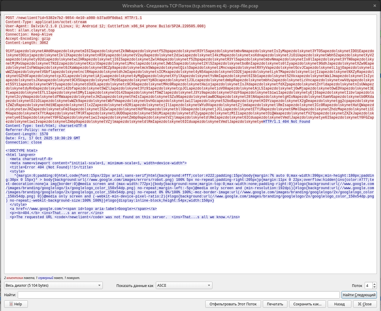 На стороне сервера чаще всего приходил HTTP-ответ HTTP/1.1 404 Not Found с HTML, то есть сервер либо не предназначен для приёма этих данных, либо endpoint временно недоступен. Несмотря на 404, клиент продолжает отсылать данные — поведение типично для агентов, которые «стучат» в C2 по расписанию и не зависят от успешного ответа.