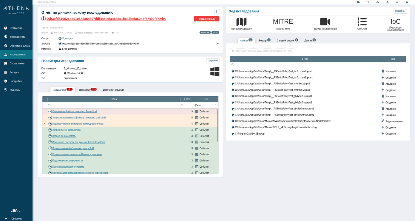 Динамический анализ в системе ATHENA выявил несколько индикаторов: