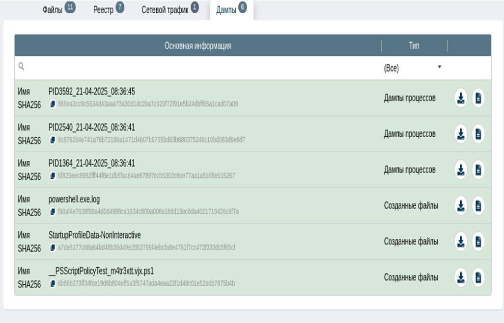 В блоке «Дампы» видно, что ПО во время работы создало файлы, которые являются легитимными.