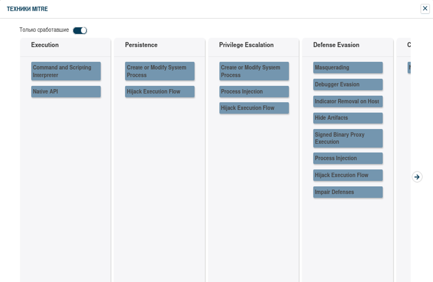 Во вкладке “Техники MITRE” видно, что отработало несколько техник: