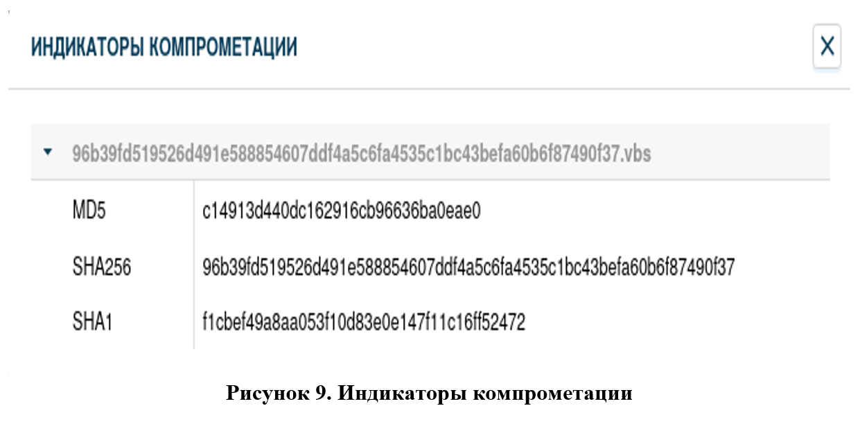 Во вкладке “Индикаторы компрометации” отображаются индикаторы компрометации вредоносного поведения файла по результатам его проверки в «песочнице».