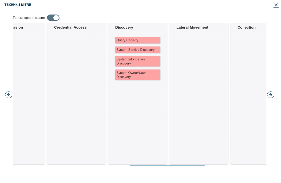 - System Service Discovery - злоумышленники собирают информацию о зарегистрированных сервисах, чтобы формировать последующее поведение. Для получения информации могут применяться утилиты операционной системы Tasklist и Net, а также другие инструменты.