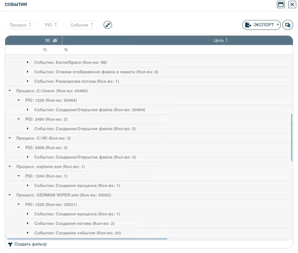 Во вкладке «События» отображаются конкретные процессы и события, которые происходят после запуска ВПО. На шифровальщик указывает создание файла/открытие файла (20464 шт.)