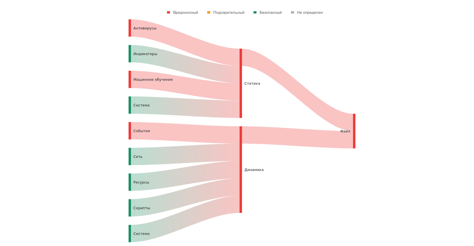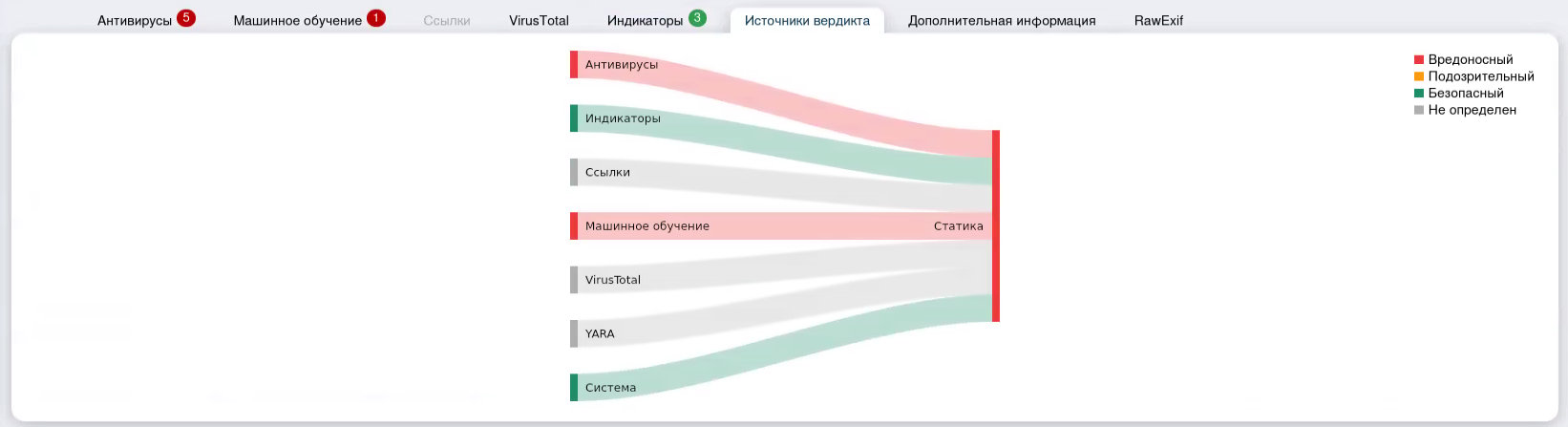 Во вкладке «Источники вердикта» строится графическая карта с источниками и их вердиктами, а также общим вердиктом по исследуемому файлу
