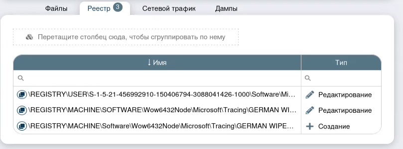 Вкладка «Реестр» показывает события в реестре операционной системы Windows