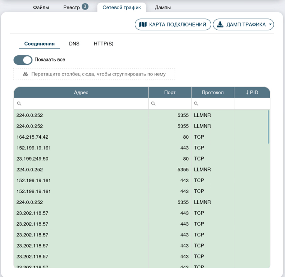 Во вкладке «Сетевой трафик» - «Соединения» представлены сетевые соединения