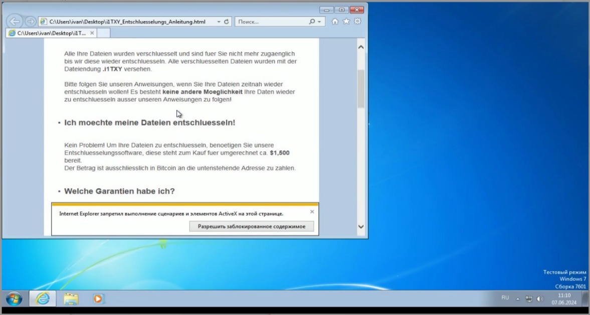 Во вкладке «Запись исследования» можно увидеть результаты после запуска файла, в процессе работы вредоносного файла создается файл с требованиями на рабочем столе