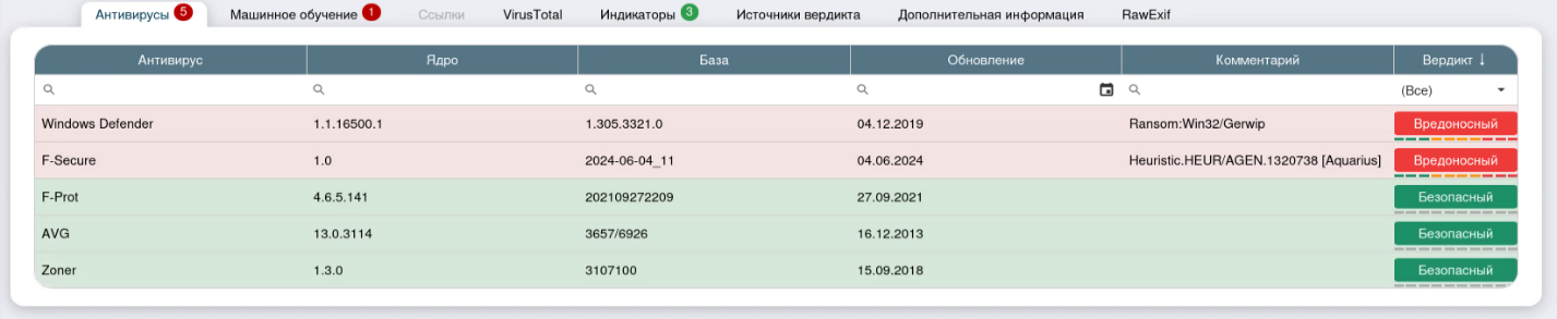 В ходе статического исследования файлу был присвоен вредоносный вердикт модулем статического анализа с помощью антивирусной проверки. Антивирусы Windows Defender и F-Secure определили наличие вредоносного вердикта в файле