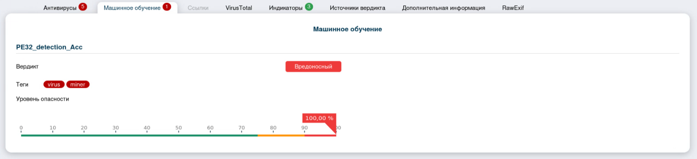 Модуль машинного обучения тоже выдал вредоносный вердикт. Присвоены теги «Virus» и «Miner»