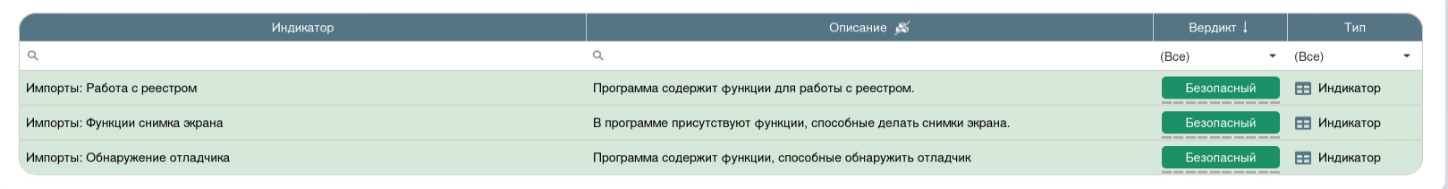 Во вкладке «Индикаторы» сработали информативные индикаторы: «Импорты: Работа с регистром», «Импорты: Функции снимка экрана», «Импорты: Обнаружения отладчика»