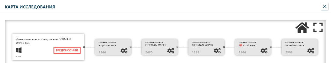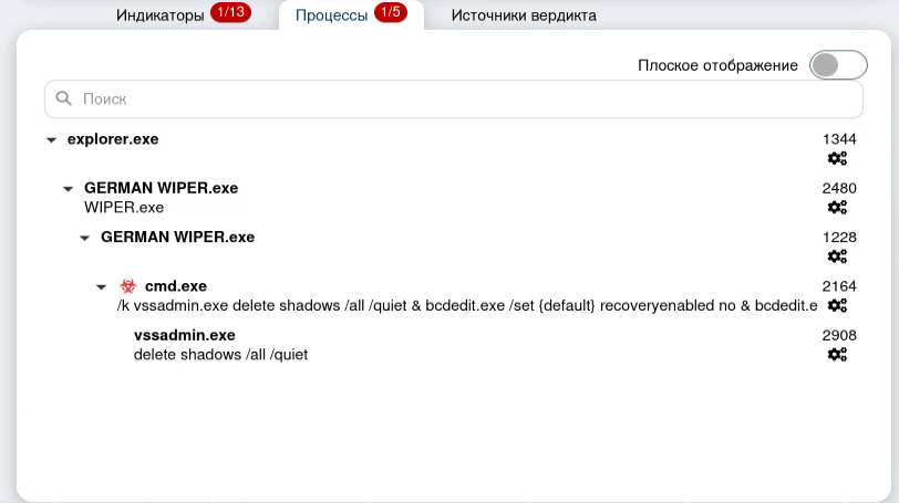 Среди системных программ, выявленных в процессе динамического исследования, были выявлены такие как: explorer.exe и GERMAN WIPER.EXE (сам файл), cmd.exe и vssadmin.exe