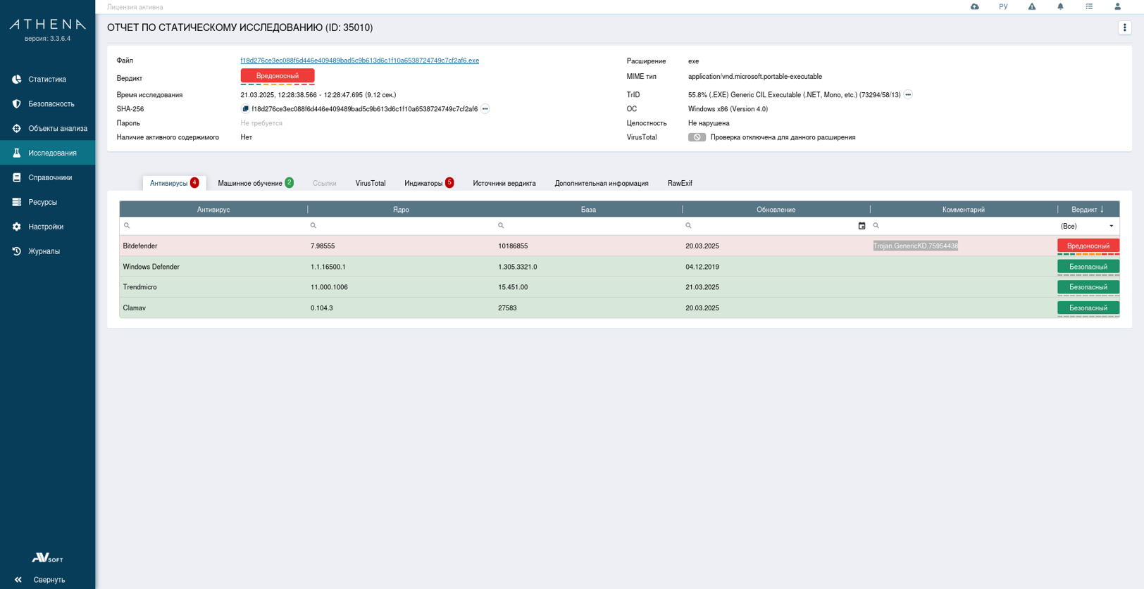В ходе статического исследования файлу был присвоен вредоносный вердикт модулем статического анализа с помощью антивирусной проверки. Антивирусный движок «Bitdefender» выявил сигнатуру в исследуемом файле : «Trojan.GenericKD.75954438».