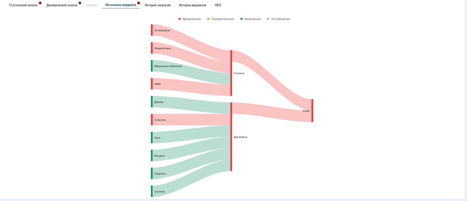 Во вкладке «Источники вердикта» строится графическая карта с источниками и их вердиктами, а также общим вердиктом по исследуемому файлу.