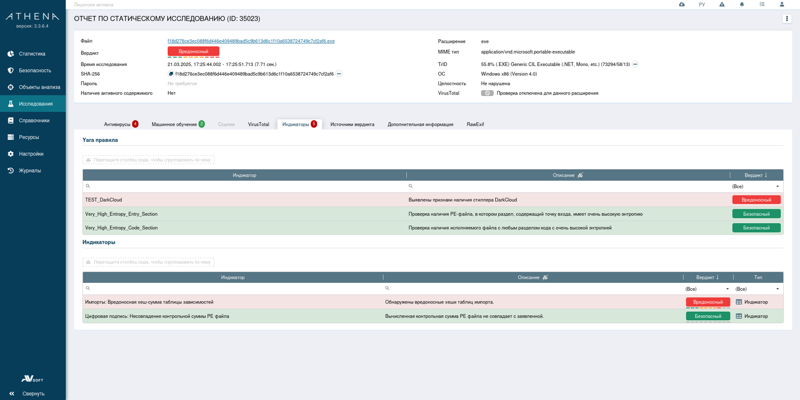 Во вкладке «Индикаторы» отработало несколько Yara-правил: «DarkCloud», «Very_High_Entropy_Entry_Section», «Very_High_Entropy_Code_Section», а также системные индикаторы: «Импорты: Вредоносная хеш-сумма таблицы зависимостей», «Цифровая подпись: Несовпадение контрольной суммы PE файла».