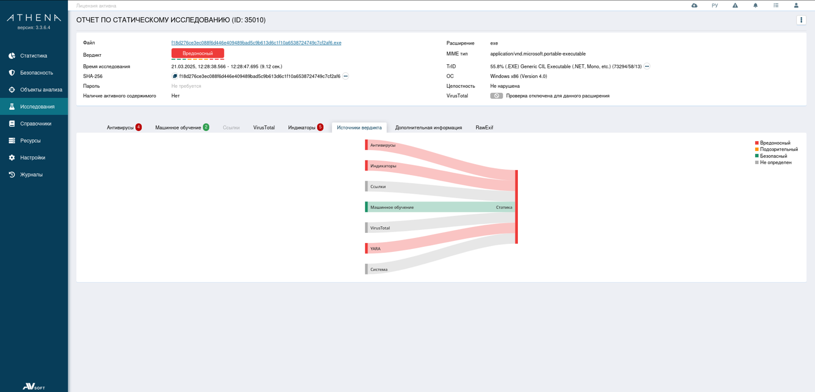 Исследования файла происходило с помощью системы ATHENA. Для начала посмотрим на статический и динамический анализ файл в системе ATHENA.