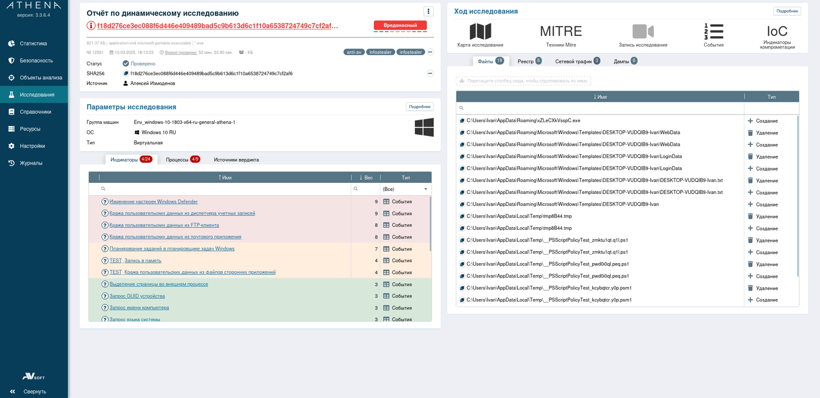 Динамический анализ в системе Афина выявил множество вредоносных индикаторов. Среди них отмечаются: