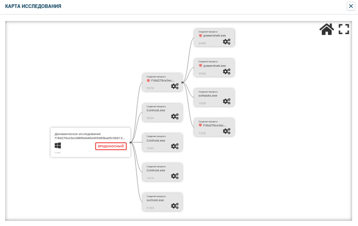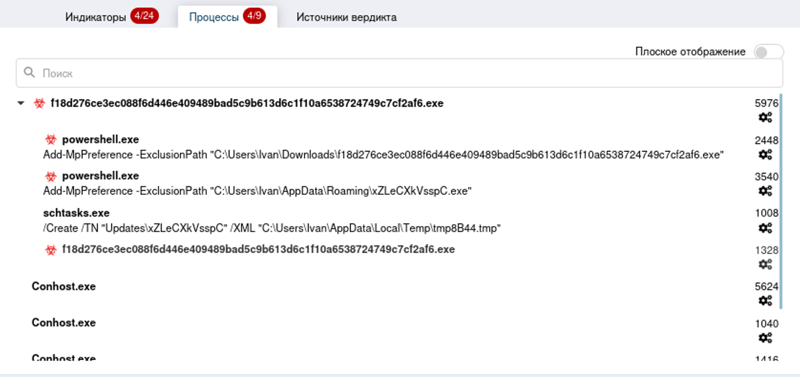 Среди системных программ, выявленных в процессе динамического исследования, были выявлены такие как: powershell.exe, schtasks.exe, Conhost.exe и svchost.exe.