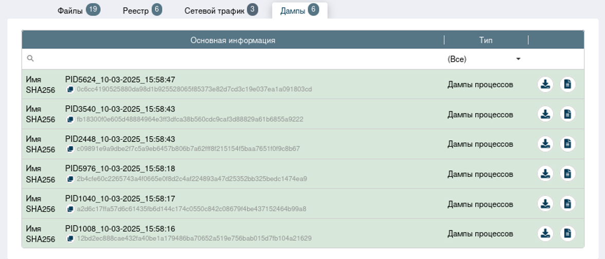 В блоке «Ход исследования» можно наблюдать изменения файлов/ключей реестра, наличие сетевого трафика, а также создание дампов с различными расширениями.