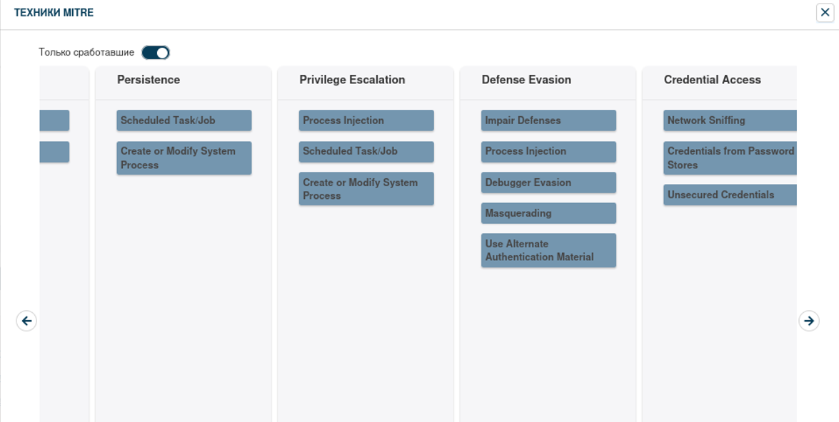 Во вкладке “Техники MITRE” видно, что отработало множество техник,вот самые интересные из них:
