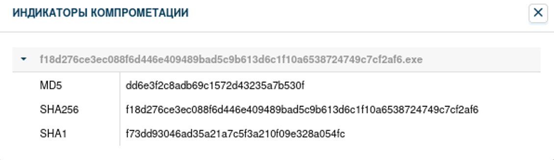 Во вкладке “Индикаторы компрометации” отображаются индикаторы компрометации вредоносного поведения файла по результатам его проверки в «песочнице».