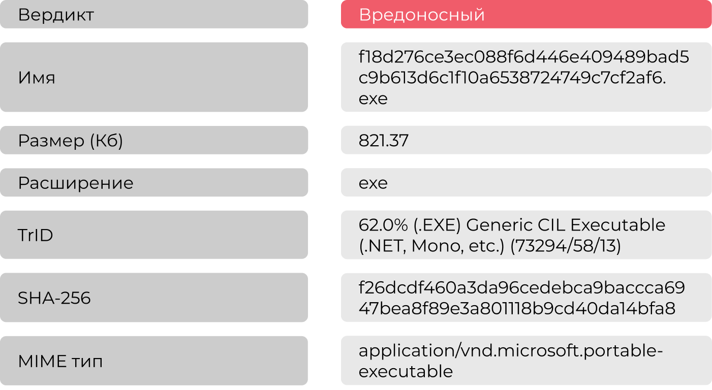 На анализ в систему Афина пришел исполняемый файл с расширением .exe. Для начала была собрана его общая информация, представленная в таблице Таблица 1.