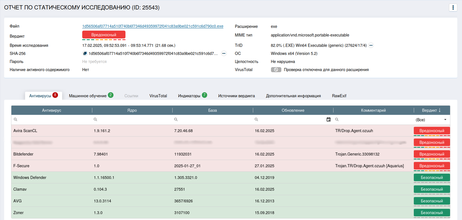 С данной вкладкой стоит просто ознакомиться, она несет в себе ин-формацию о том, какие методы и модули статического анализа выдали вердикт после проверки данного ПО.