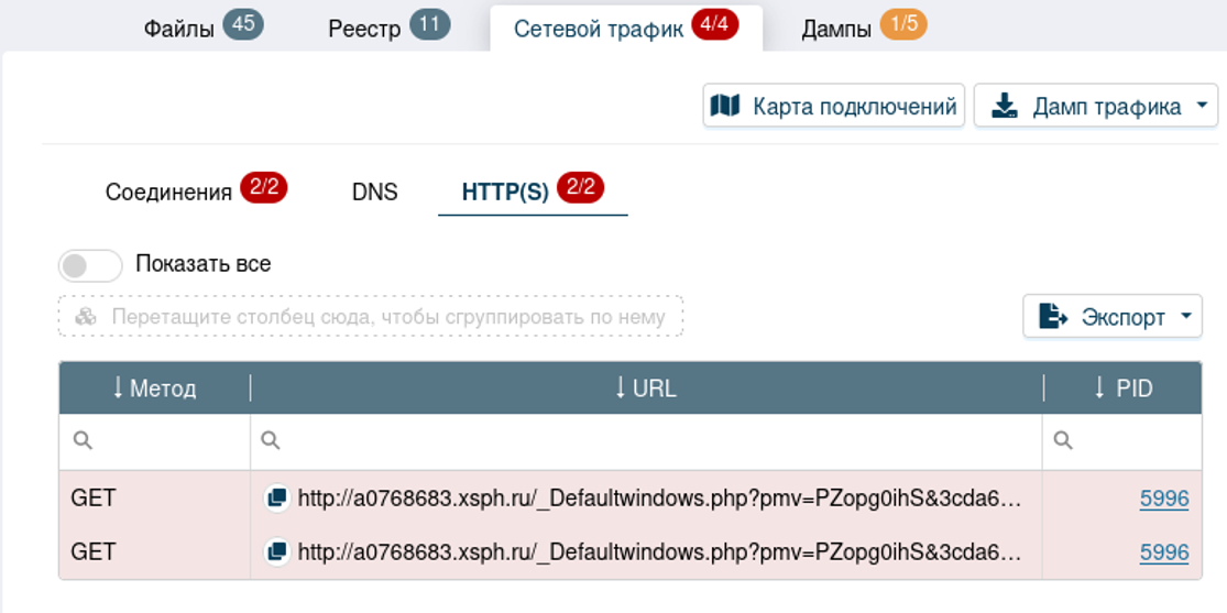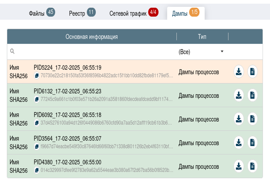 В блоке «Дампы» видно, что ПО во время работы был создан подозрительный процесс PID5224_17-02-2025_06:55:19
