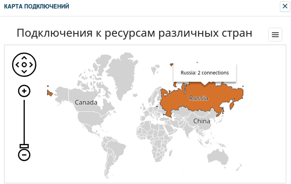 Карта подключений показывает то, с адресами каких стран взаимодействует образец.