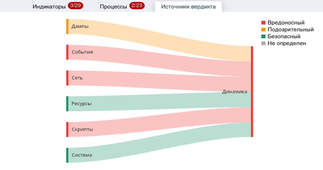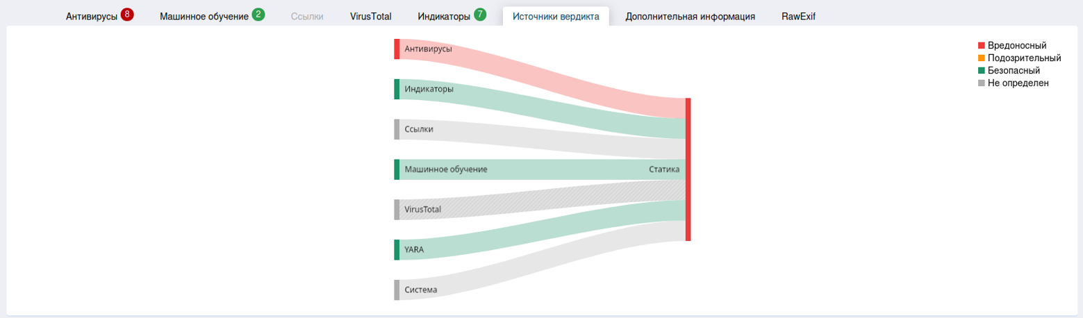 Во вкладке «Источники вердикта» можно ознакомиться с тем, какие источники посчитали файл вредоносным.