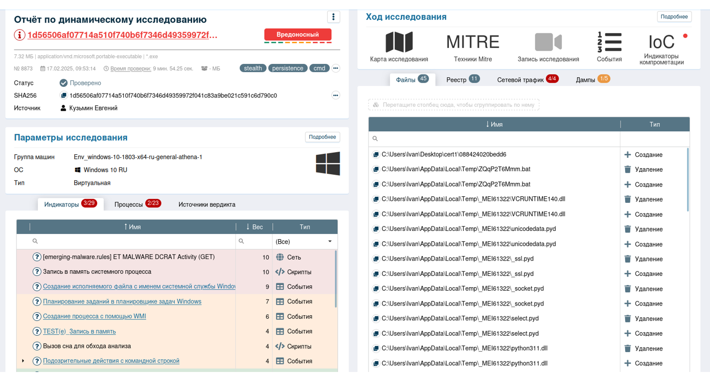 Динамический анализ в системе ATHENA выявил несколько индикаторов: