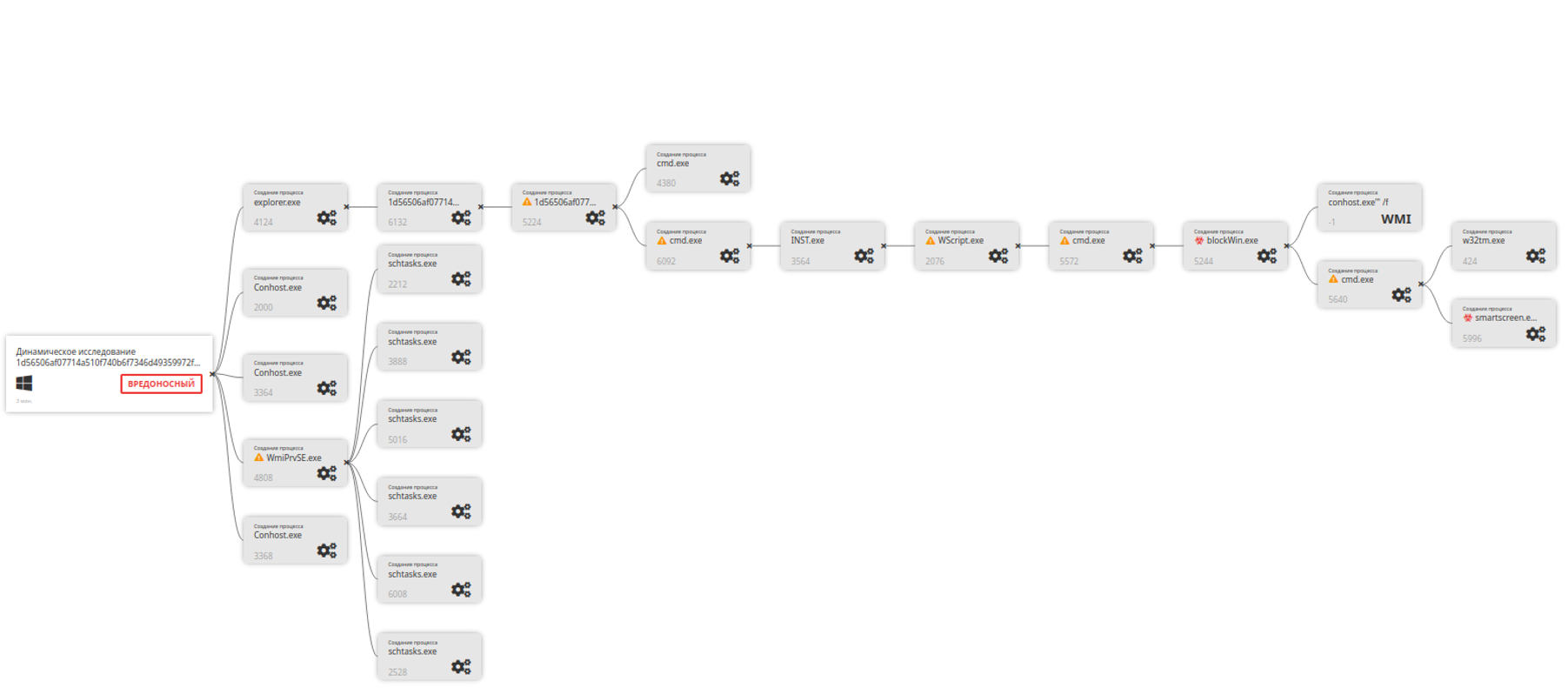 Среди системных программ, выявленных в процессе динамического исследования, были выявлены такие как: cmd.exe, INST.exe, Wscript.exe, blockWin.exe, w32tm.exe, smartscreen.exe, conhost.exe, schtasks.exe.