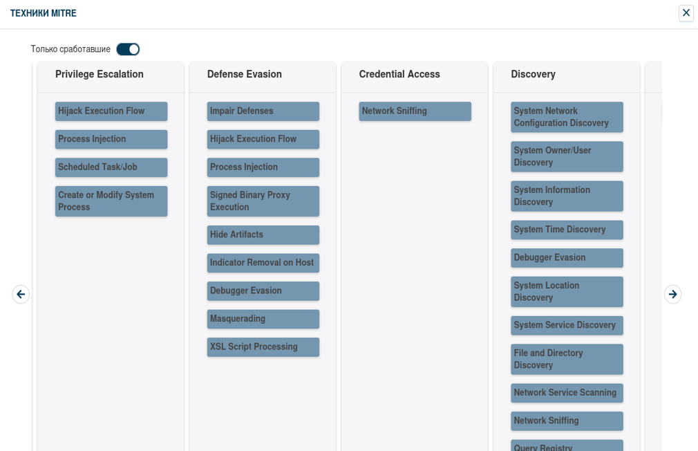 Во вкладке “Техники MITRE” видно, что отработало несколько техник: