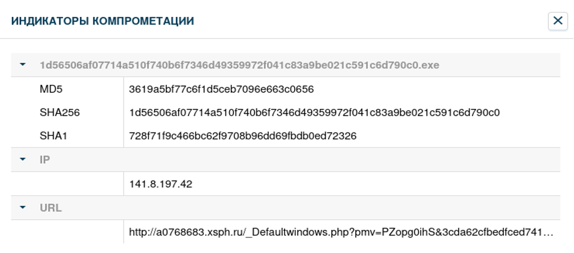 Во вкладке “Индикаторы компрометации” отображаются индикаторы компрометации вредоносного поведения файла по результатам его проверки в «песочнице».