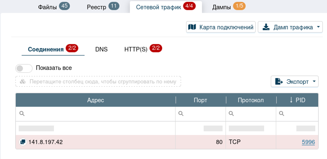Вкладка «Сетевой трафик» показывает вредоносную сетевую активность. В данном случае идёт соединение с IP 141.8.197.42:80. Данный адрес suricata определила как вредоносный.