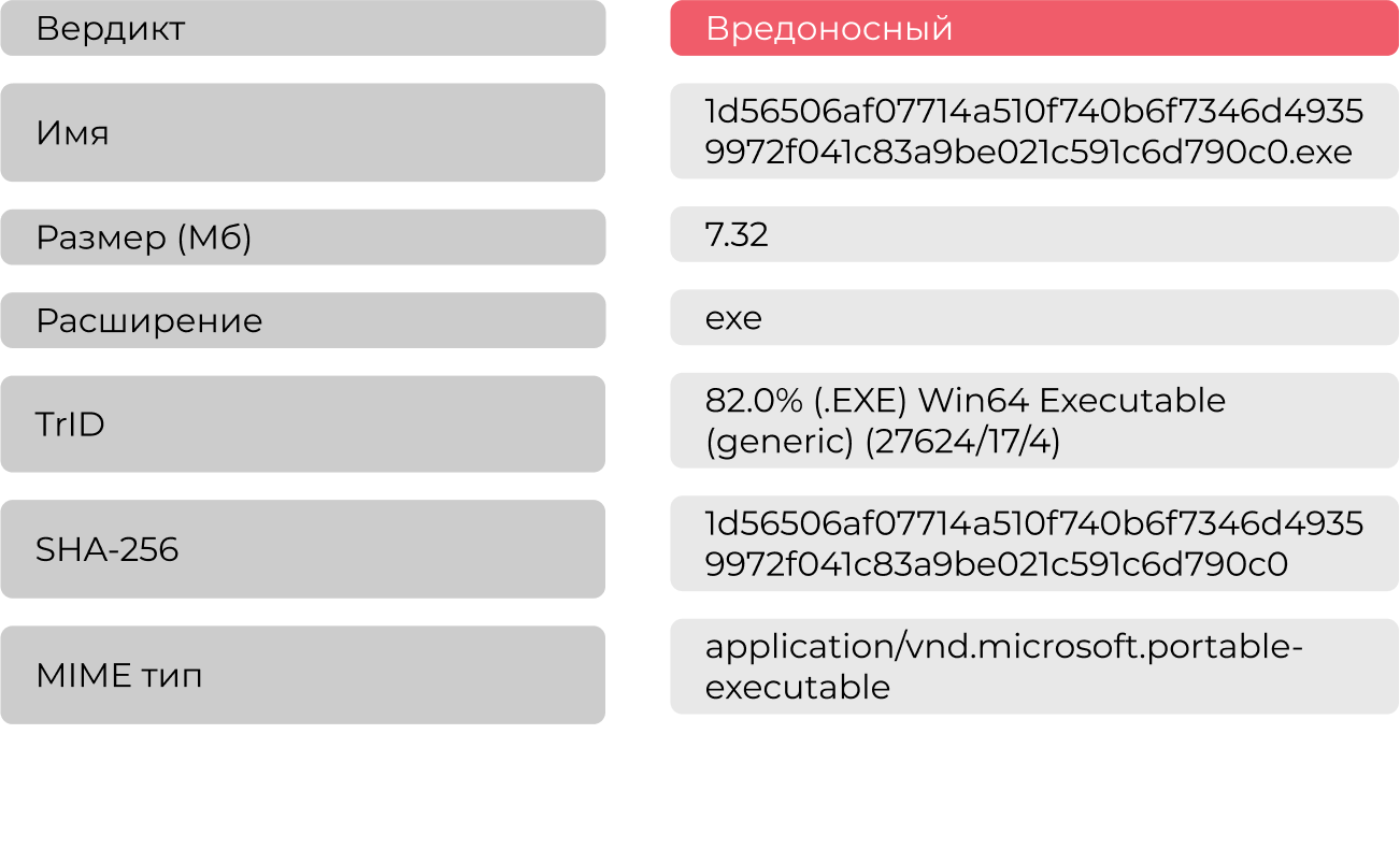 На анализ в систему Афина пришел исполняемый файл с расширением .exe. Для начала была собрана его общая информация, представленная в таблице Таблица 1.