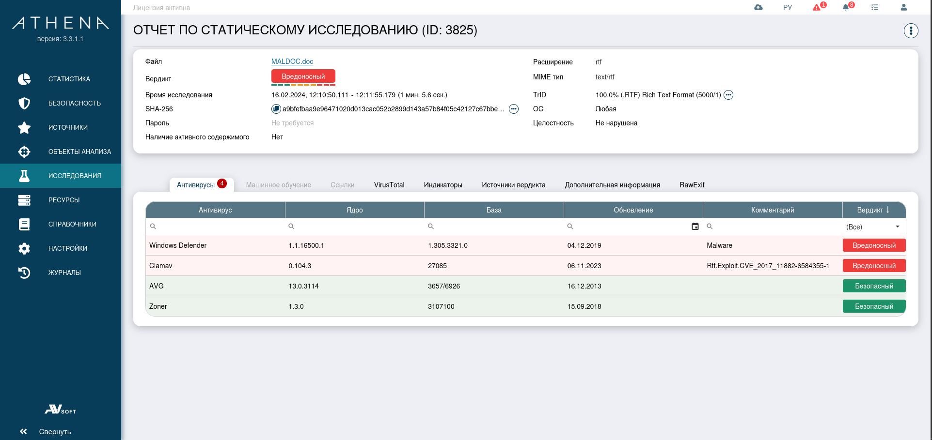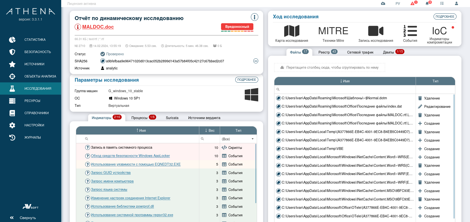 Динамический анализ в системе ATHENA выявил несколько индикаторов: